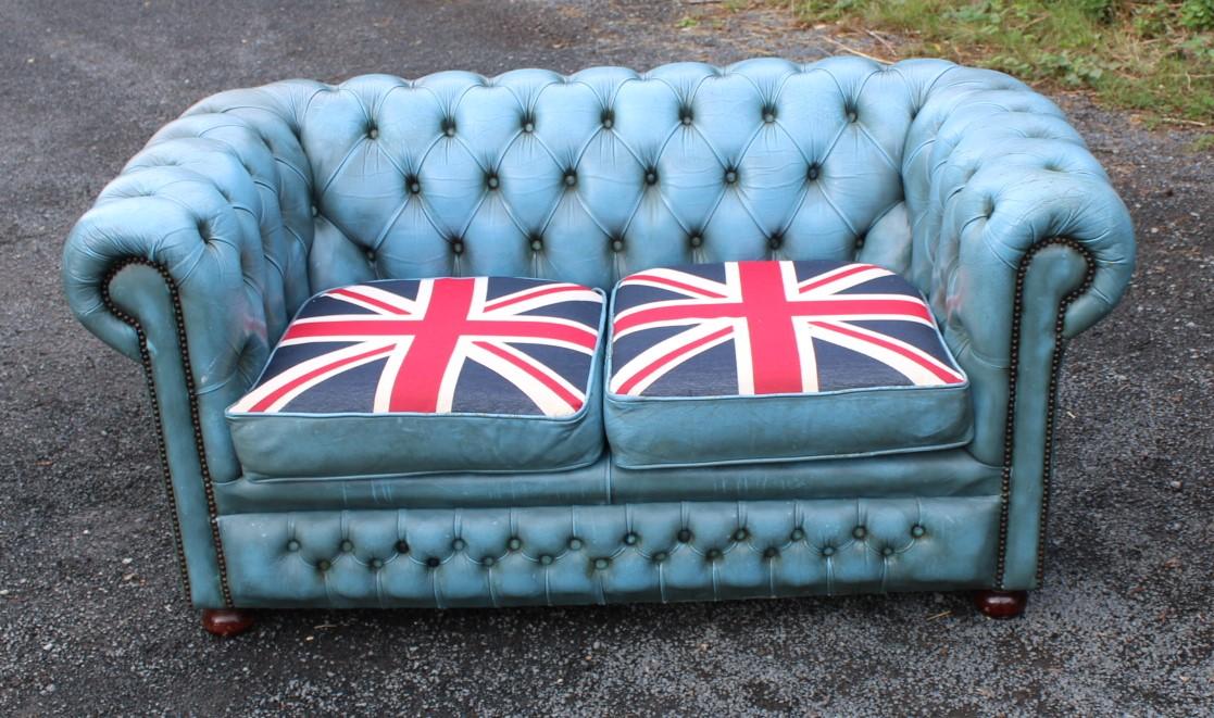 1960s 2 Seater Blue Leather Chesterfield Settee with Union Jack Cushions