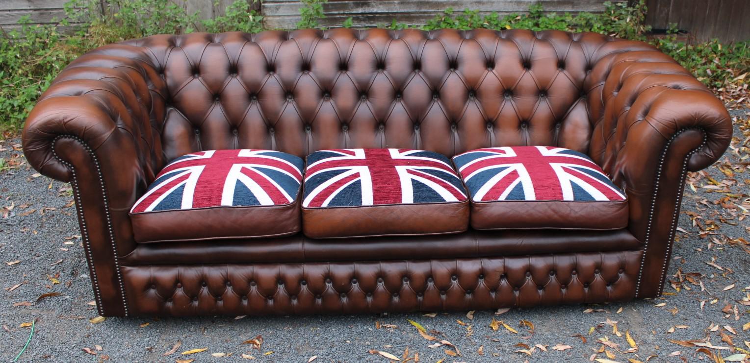 1960s 3 Seater Brown Leather Chesterfield Sofa with Union Jack
