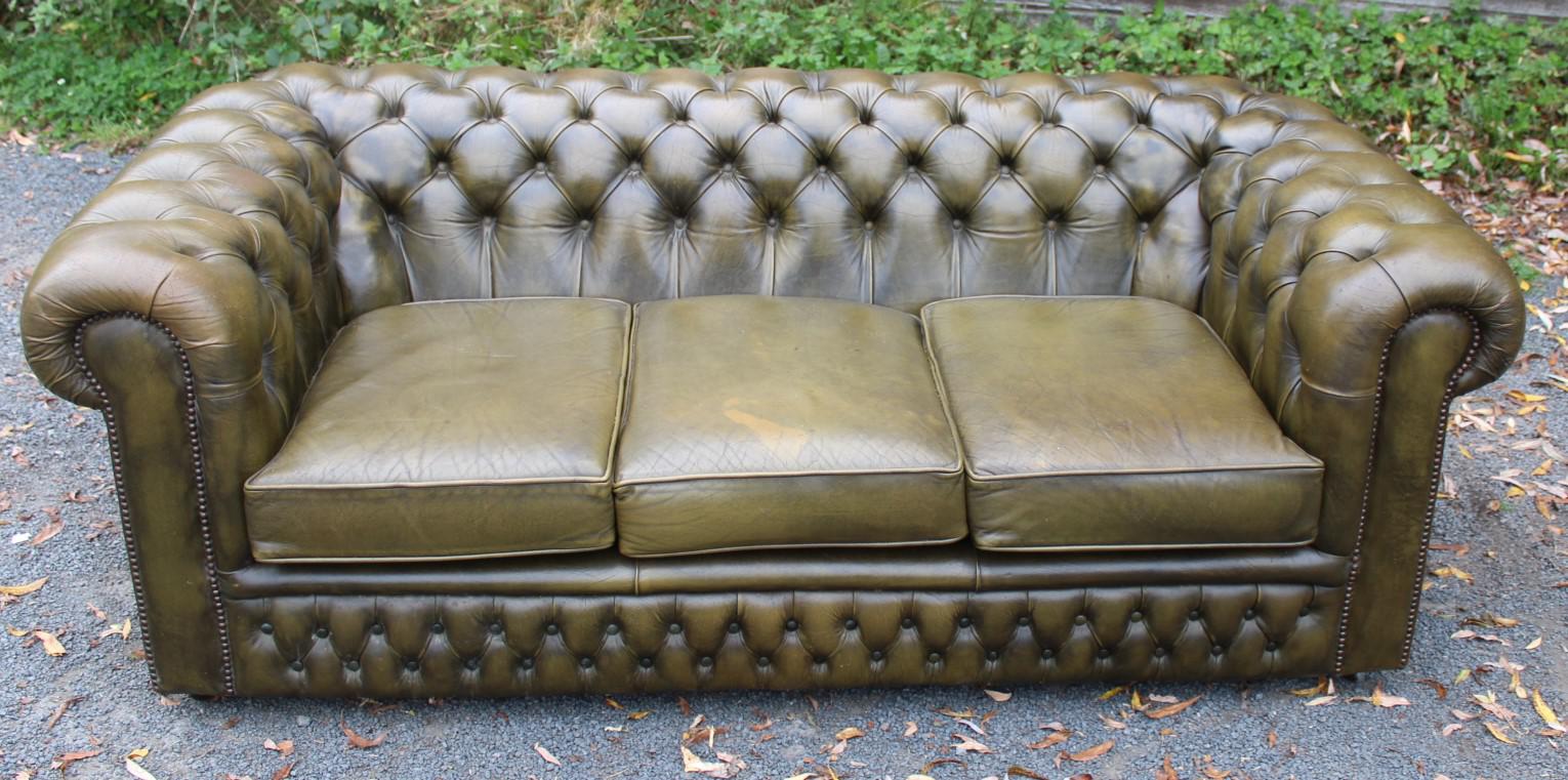 1960s 3 Seater Green Leather Chesterfield Sofa