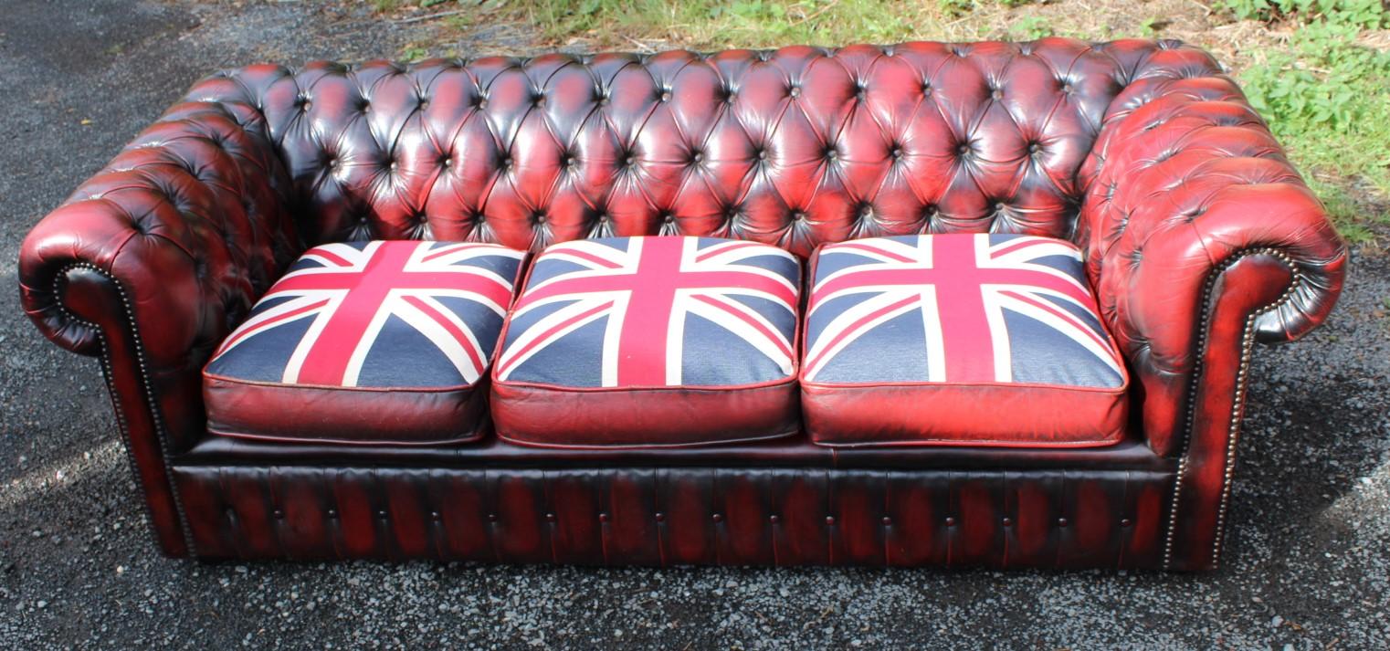 1960s 3 Seater Red Leather Chesterfield Settee with Union Jack Cushions