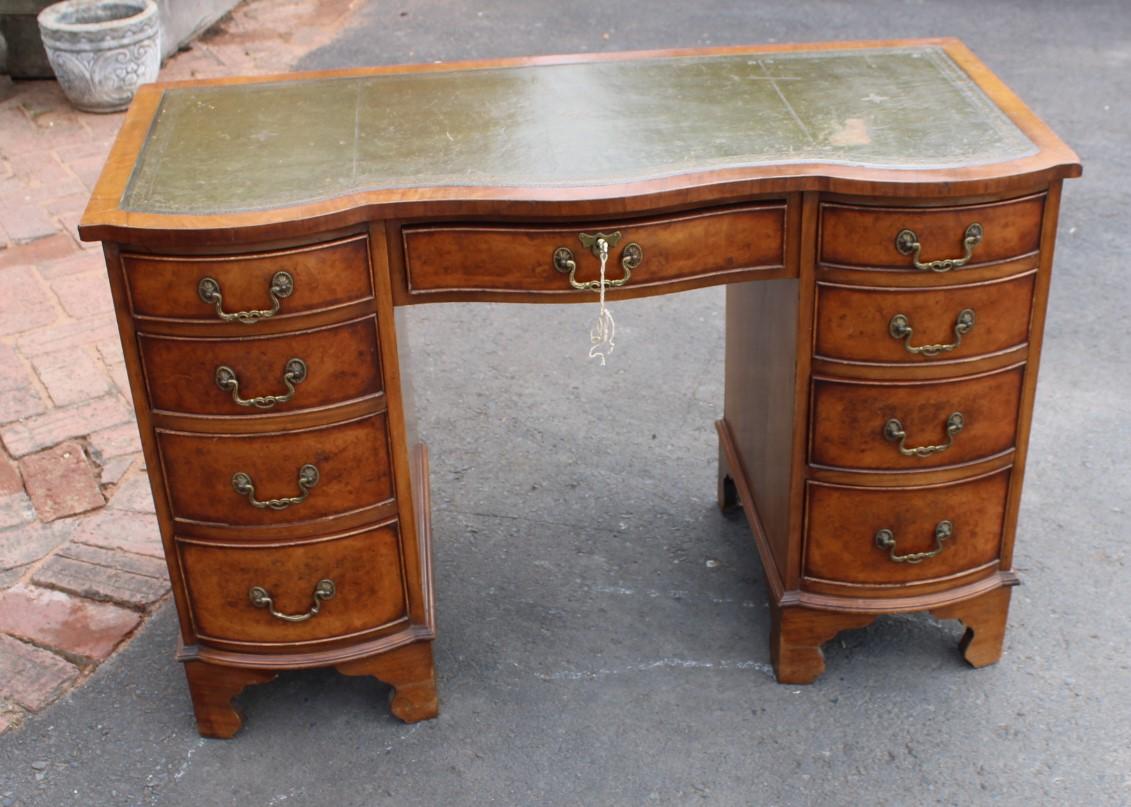 1960s Burr Walnut Serpentine Desk with Green Leather