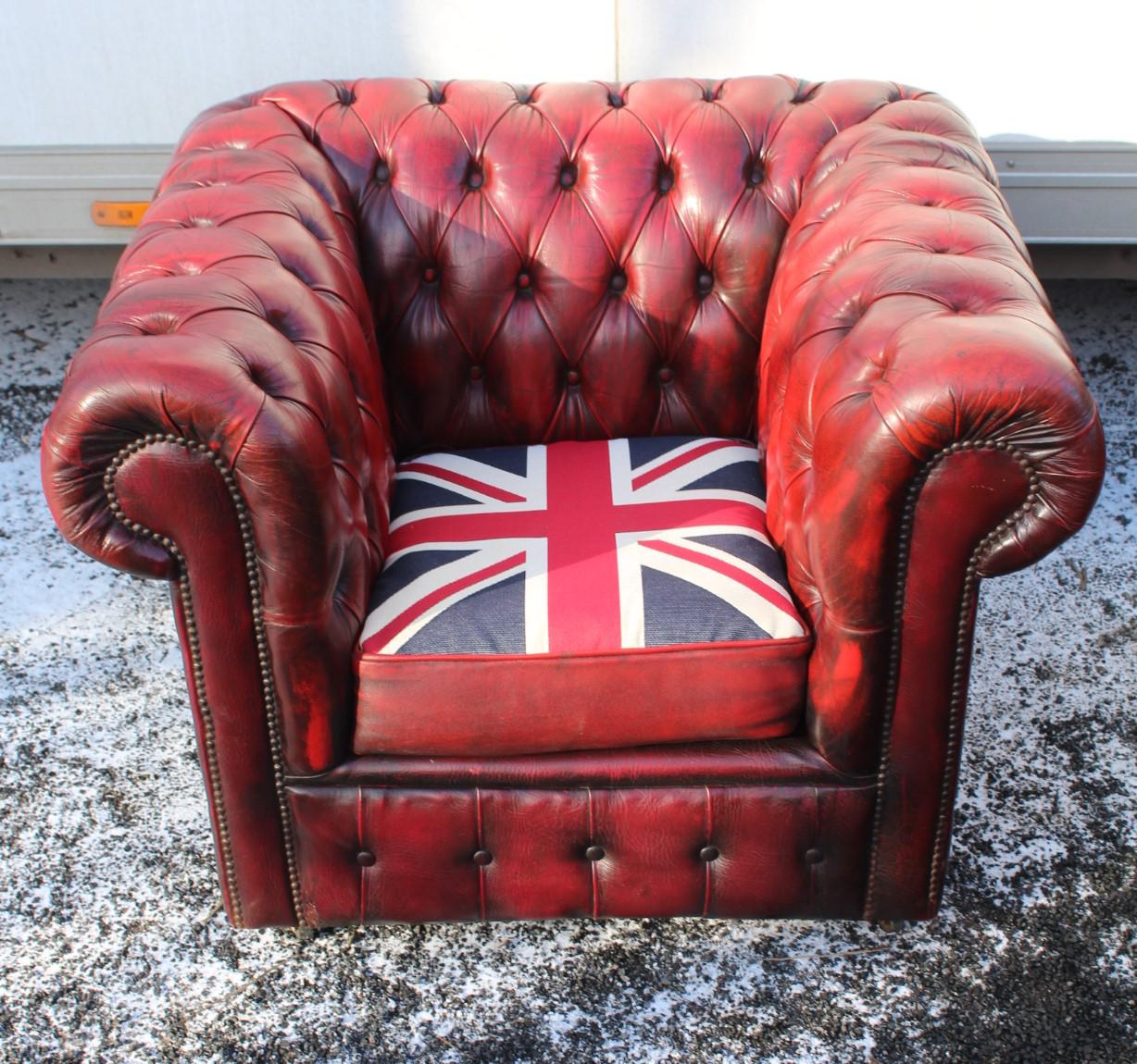 1960s Chesterfield Red Leather Tub Chair with Union Jack on Seat