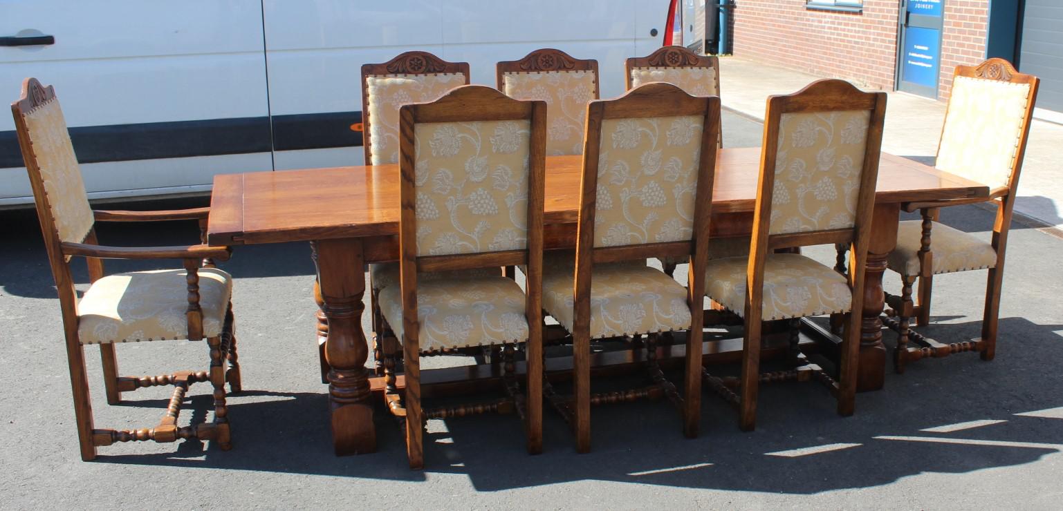 1960's Dining Suite Oak Refectory Table + Set 8 Oak Chairs Pale Yellow Seats