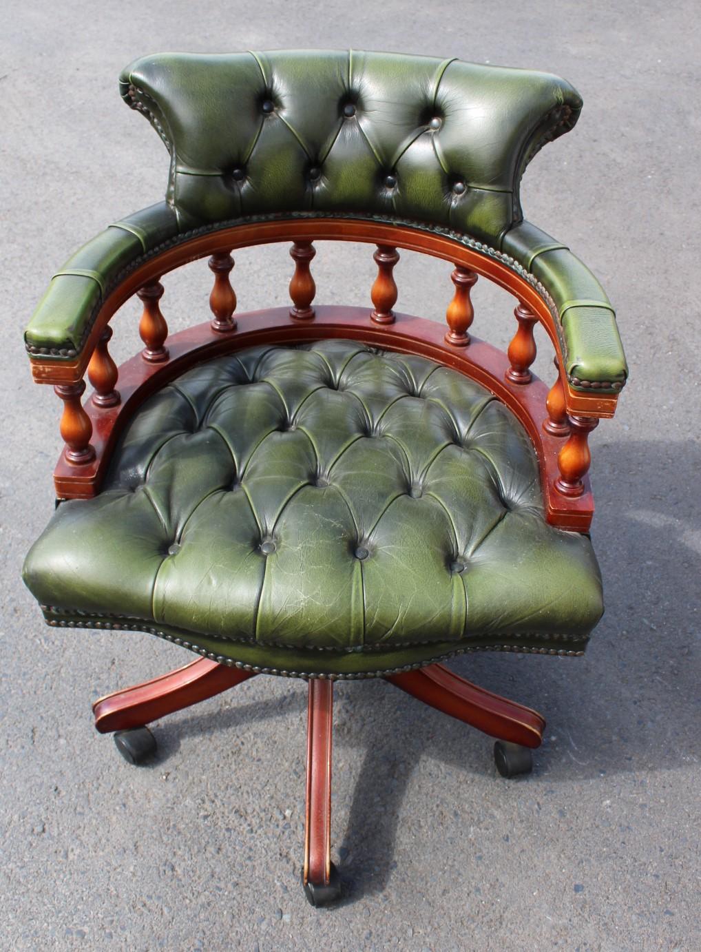 1960s Green Leather Mahogany Office Swivel Desk Chair