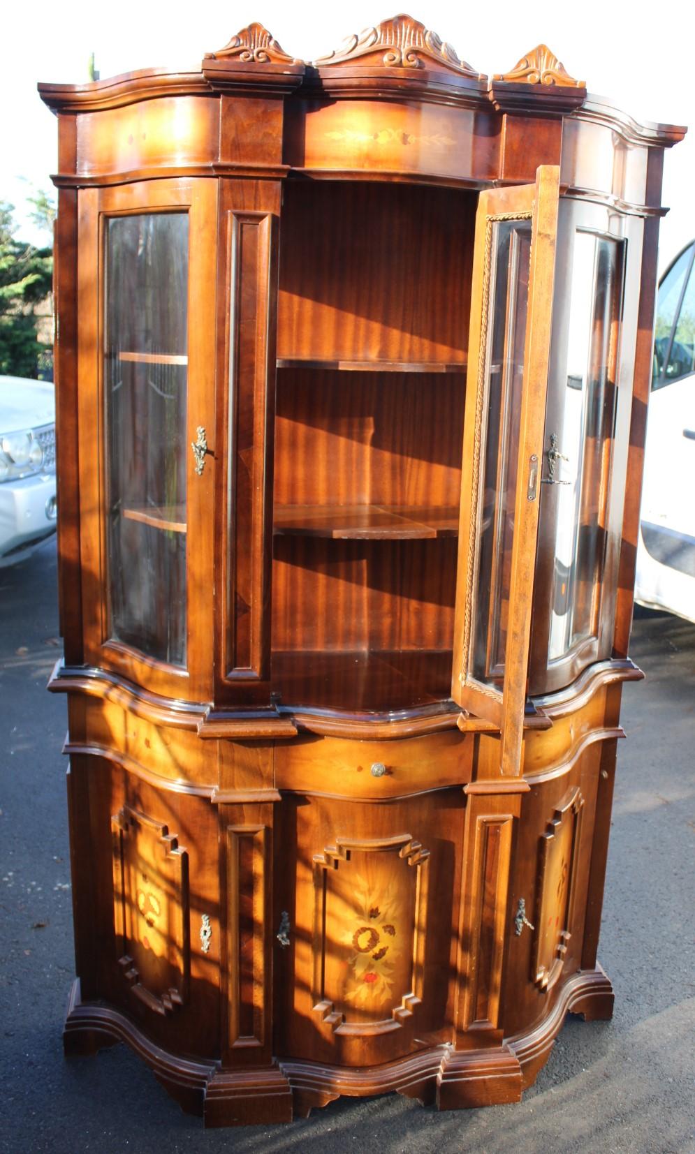 1960s Large Burr Walnut Copy Dutch Serpentine Glass Cabinet on Stand