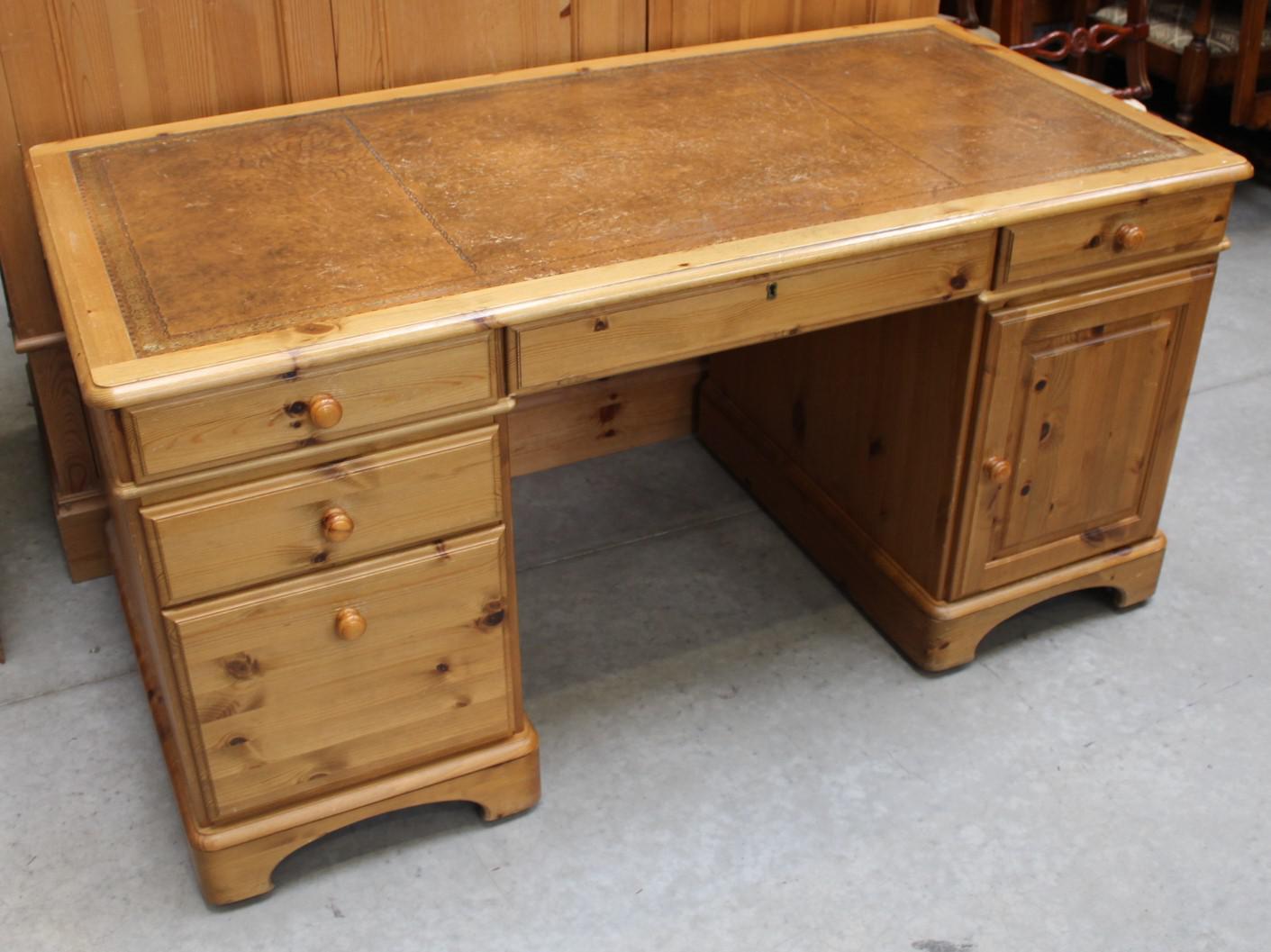 1960's Large Ducal Pine Pedestal Desk with Brown Leather inset on Top