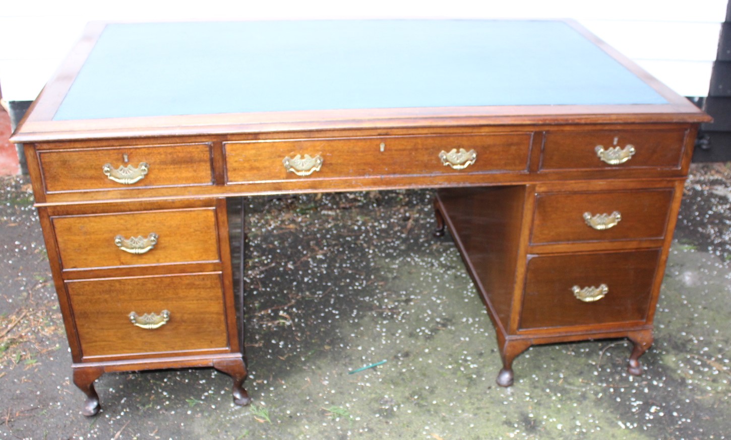 1960s Large Mahogany Pedestal Desk with Blue Leather Top
