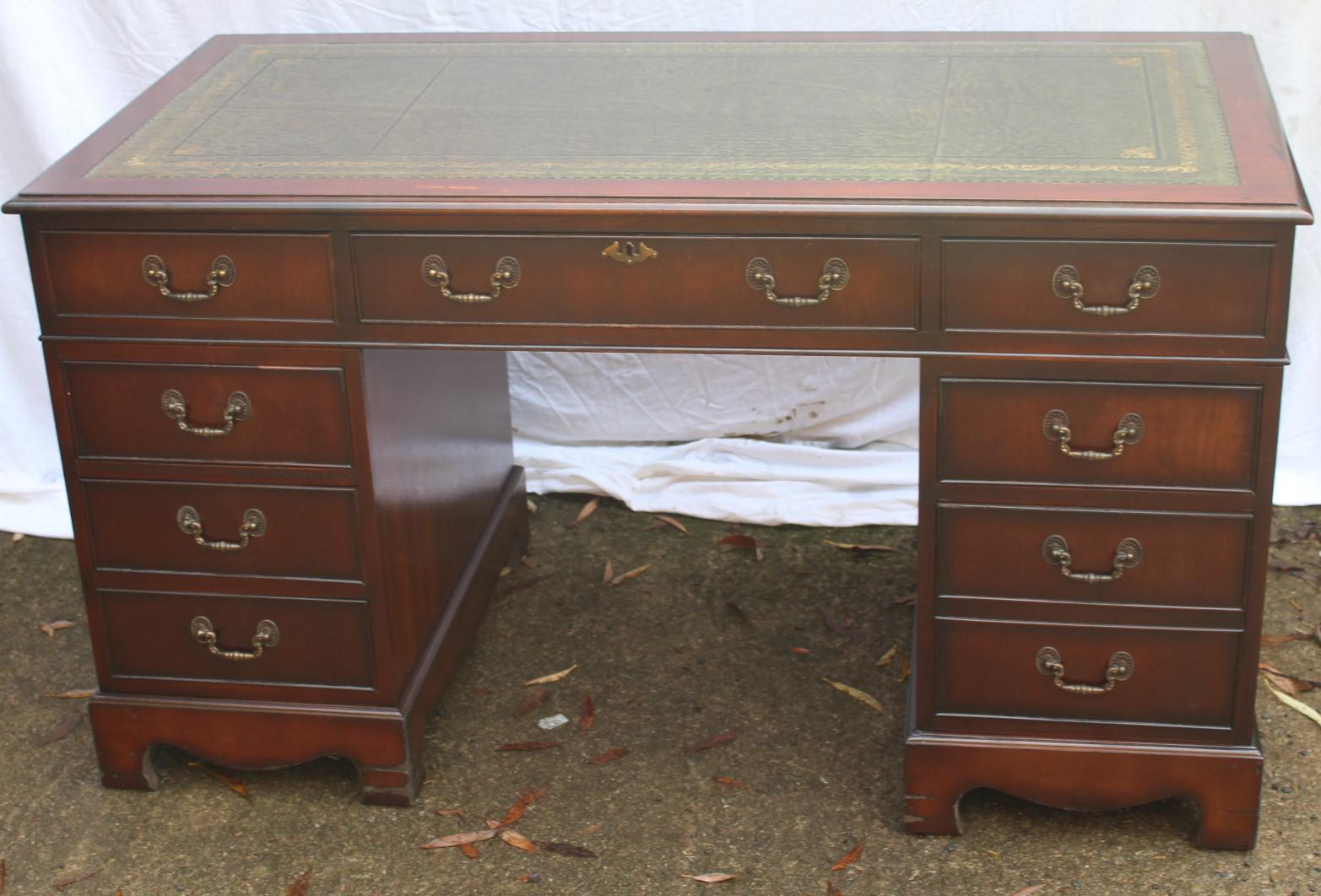 1960's Large Mahogany Pedestal Desk with Green Leather Inset + Key