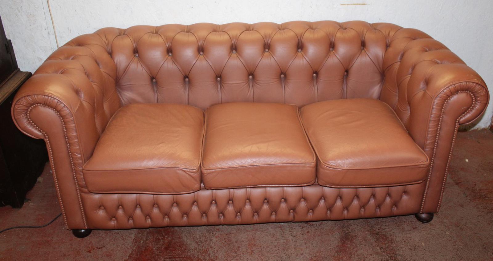 1960's Leather Chesterfield 3 Seater Sofa Upholstered Light Tan