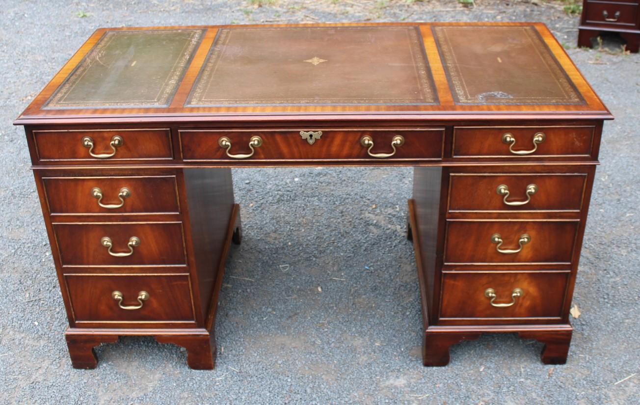 1960s Mahogany Bevan & Funell Pedestal Desk with Brown Leather + Key