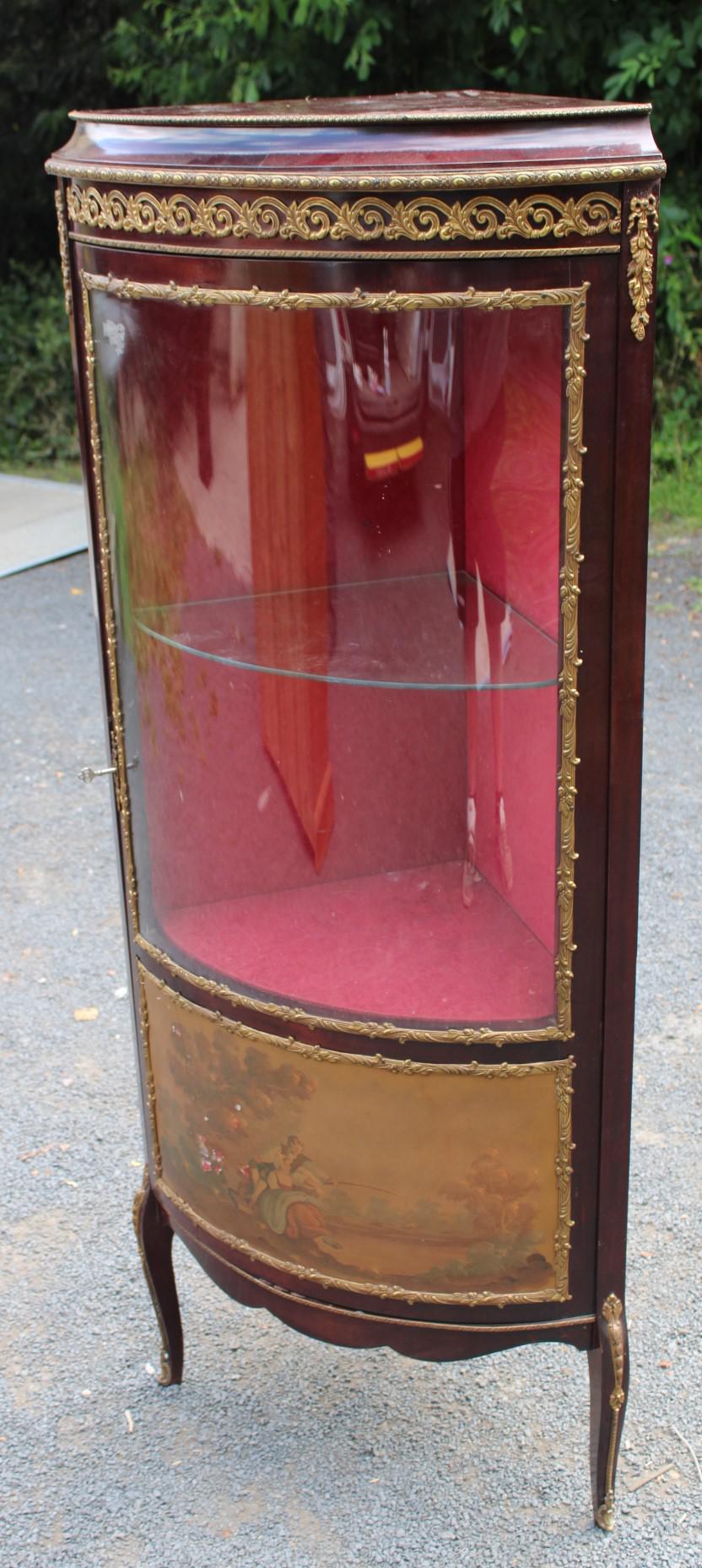 1960s Mahogany Bow Vitrine China Corner Cabinet with Painted Scene and Shelves