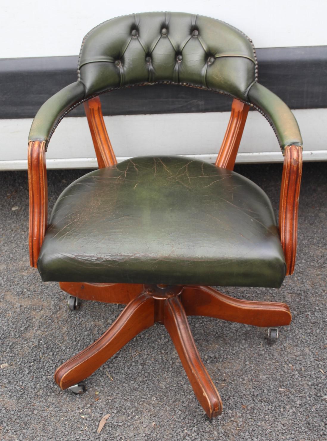 1960s Mahogany Green Leather Swivel Office Chair