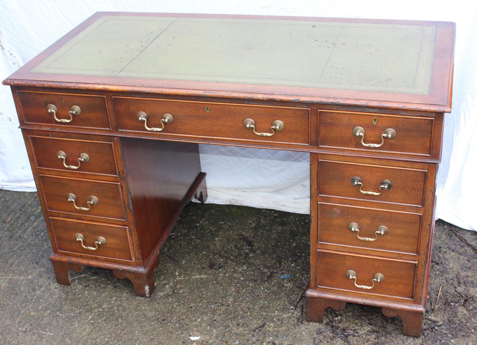 1960's Mahogany Pedestal Desk with Green Leather Inset