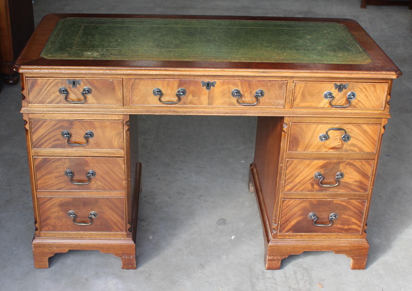 1960's Mahogany Pedestal Desk with Green Leather Inset on Top