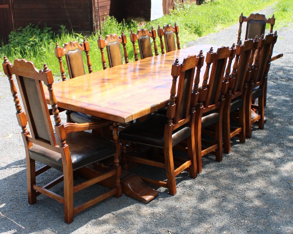 1960's Oak Dining Suite with Refectory Table & Set 10 Chairs - 8+2 Carvers
