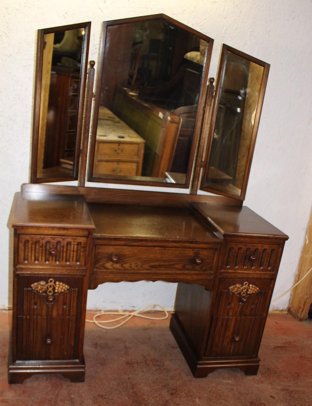 1960s Oak Linen Fold Dressing Table with Triple Mirrors