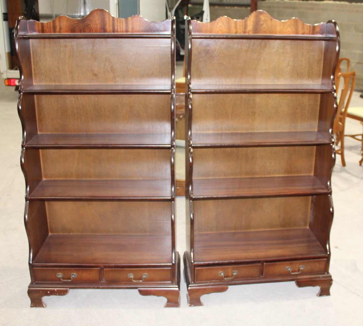 1960s Pair of Mahogany Waterfall Open Bookshelves with Drawer at Base