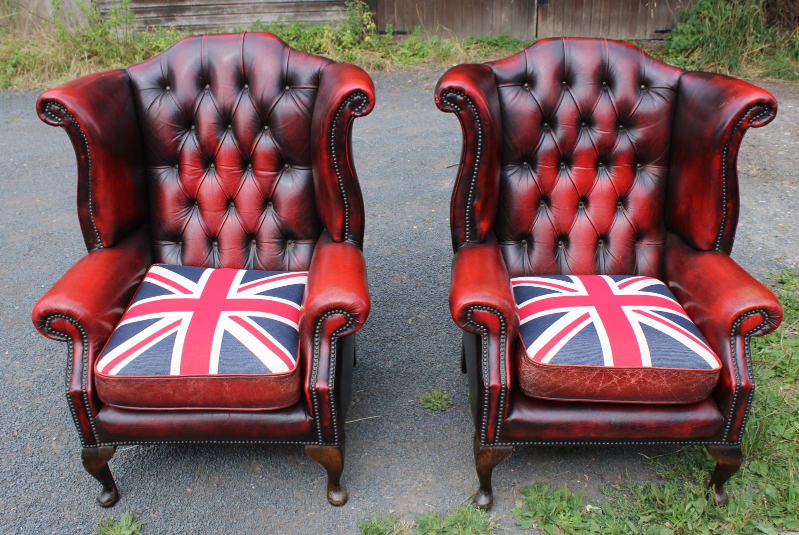 1960s Pair Red Leather Wingback Armchairs with Union Jack