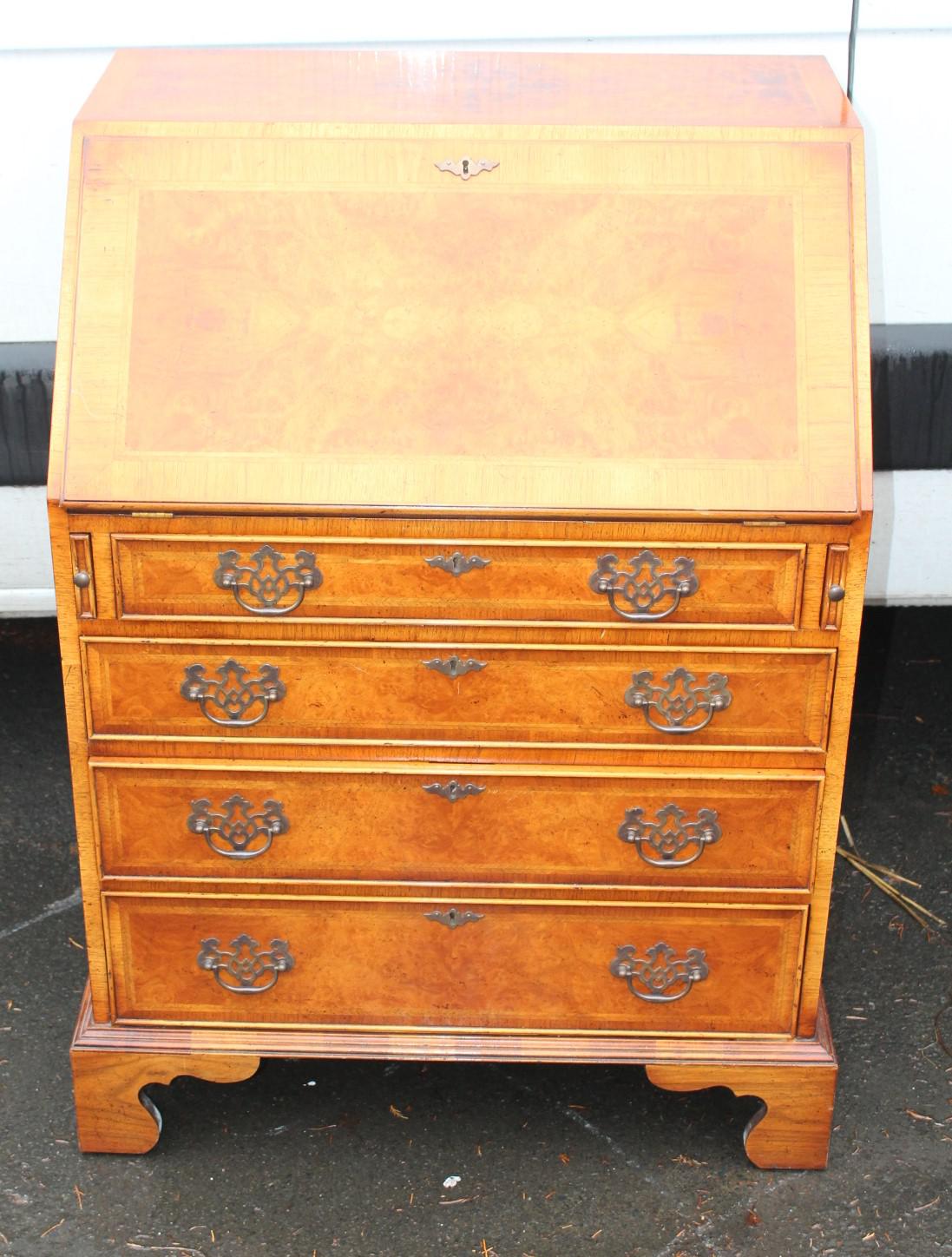 1960's Quality Burr Walnut Bureaux with Nice Inlay + Key