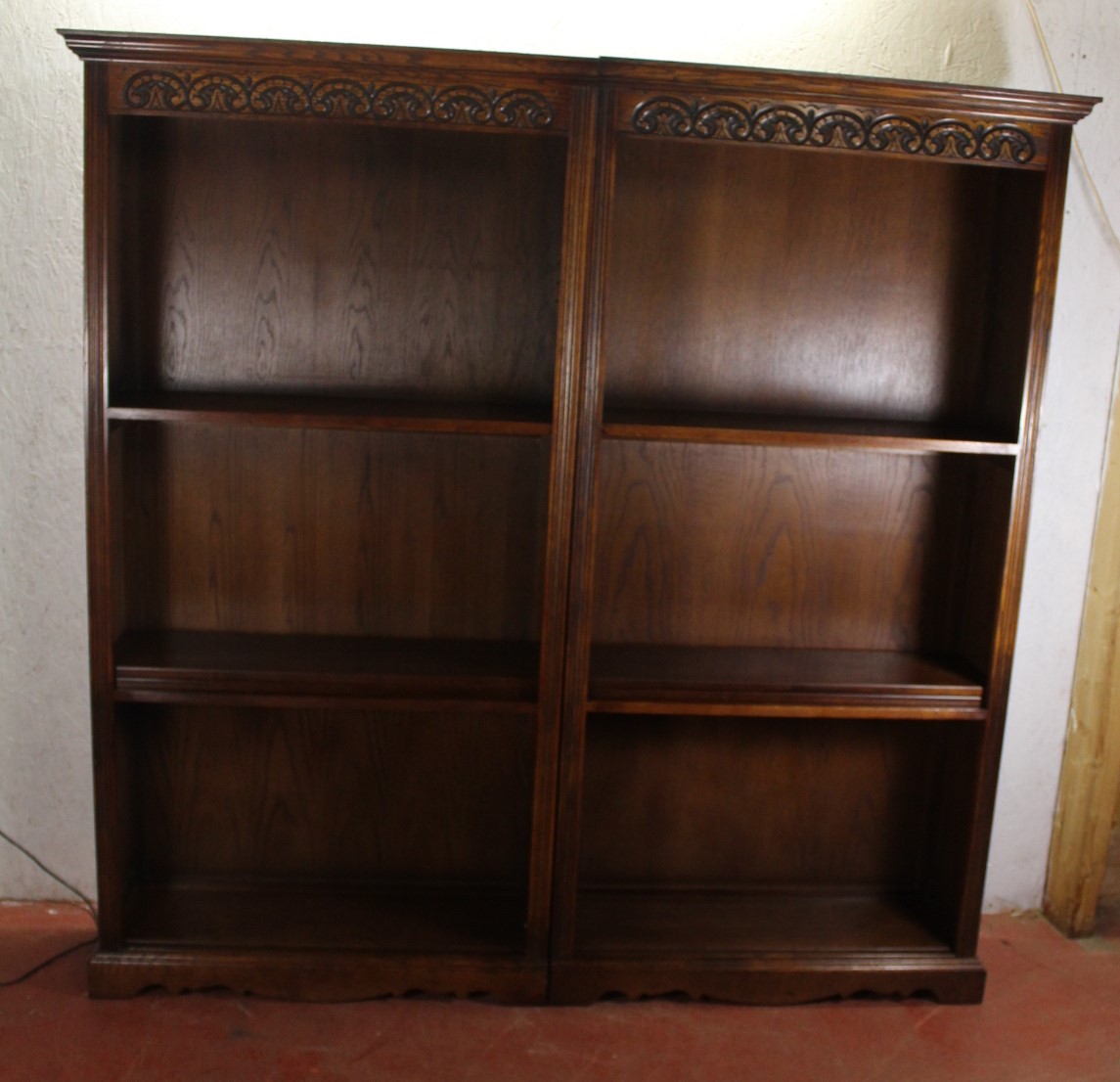 1960s Quality Pair of Oak Old Charm Open Bookshelves Carved Top Cornice