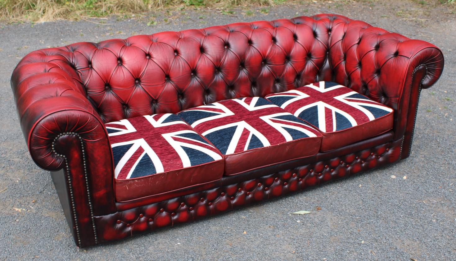 1960s Red Leather Chesterfield 3 Seater Sofa with Union Jack Cushions