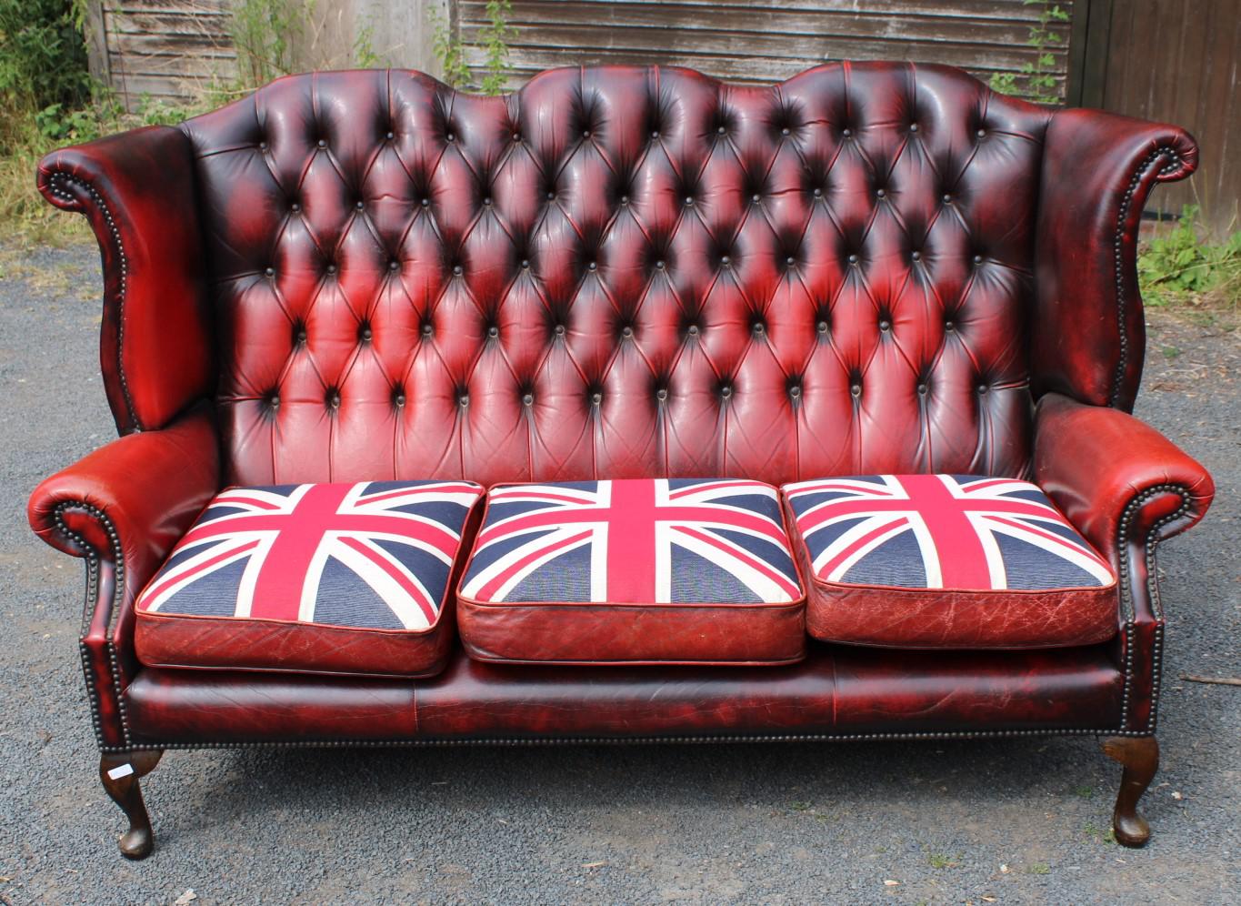 1960s Red Leather Chesterfield Wingback 3 Seater Sofa with Union Jack Cushions