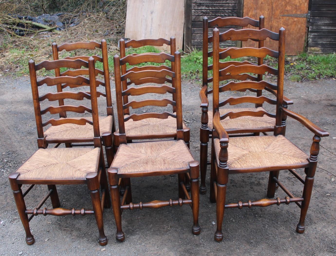 1960s Set 6 Medium Oak Ladderback Chairs Rush Seats 4+ 2 Carvers