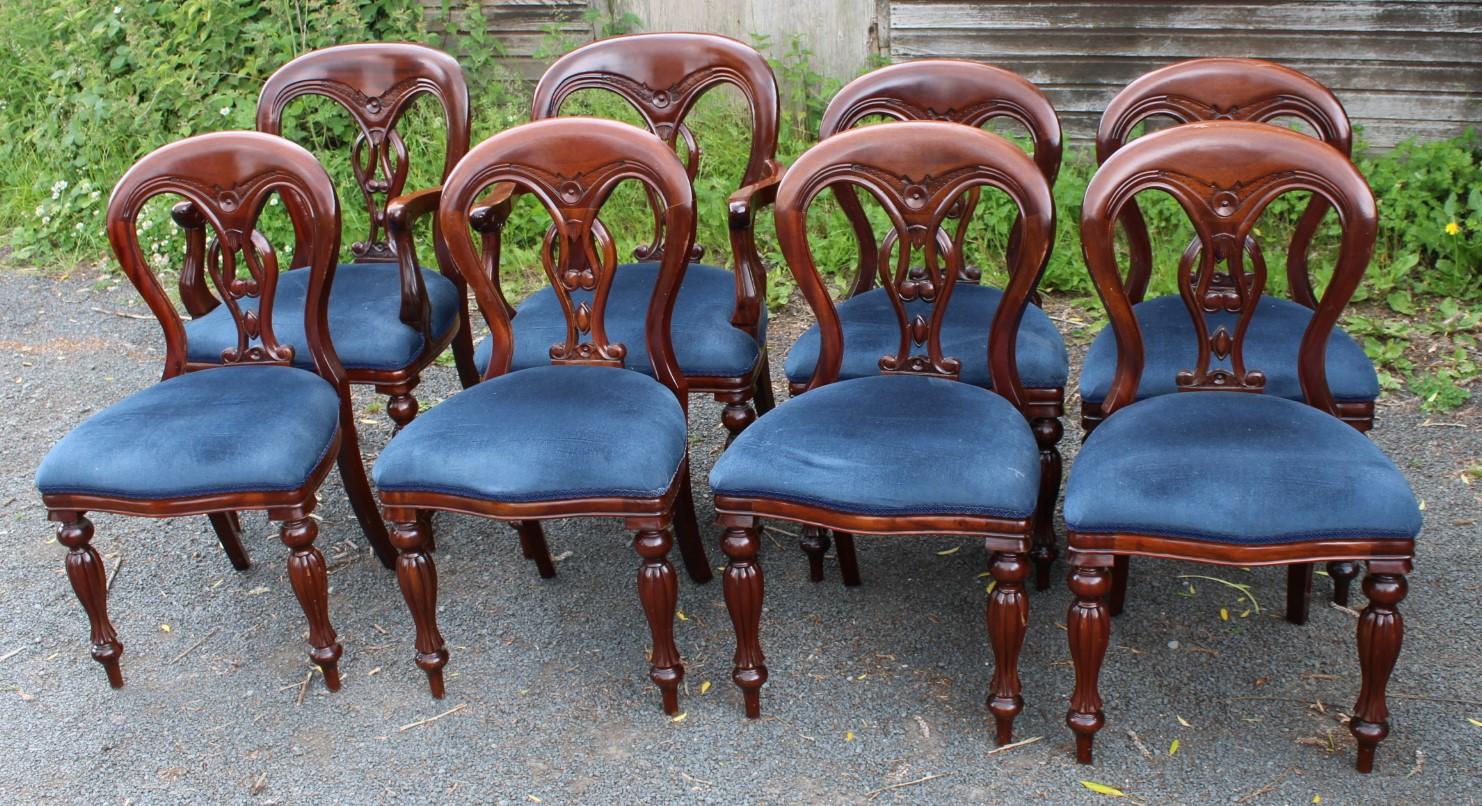 1960's Set 8 Mahogany Balloon Back Dining Chairs in Blue. 6+2 Carvers