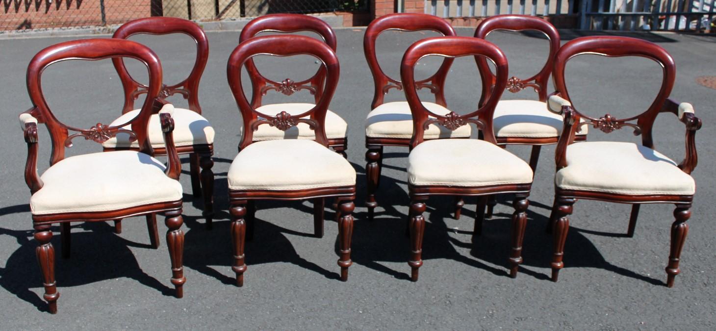 1960's Set of 8 Mahogany Balloon Back Dining Chairs in Cream. 6+2 Carvers