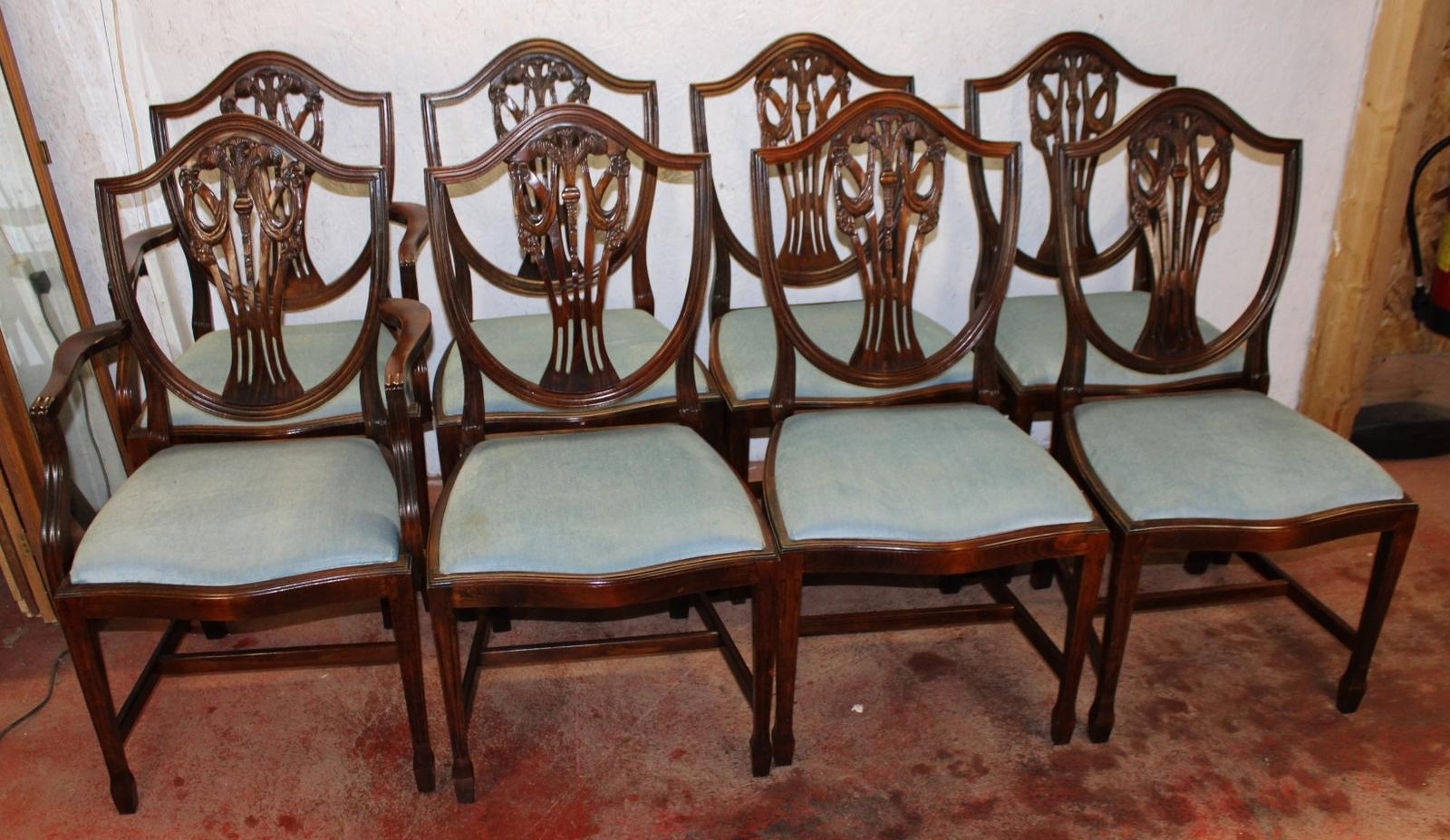 1960s Set of 8 Mahogany Wheatcheaf Style Chairs - 6 + 2 Carvers Blue Pop Out Seats