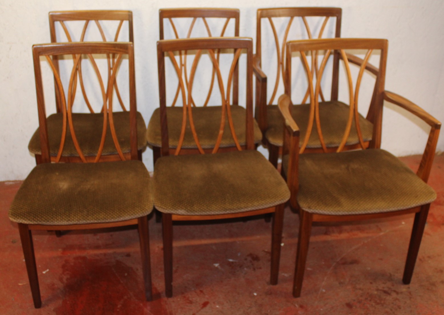1960s Set of Retro Walnut Dining Chairs 4 + 2 Carvers