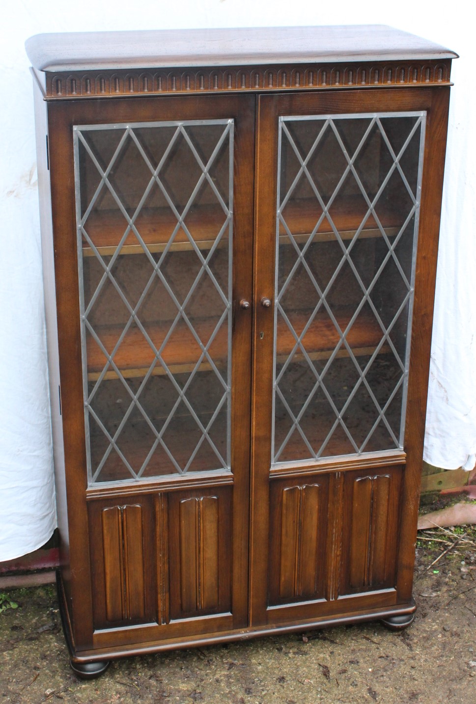 1960s Slim Oak Cabinet with Lead Glass Doors