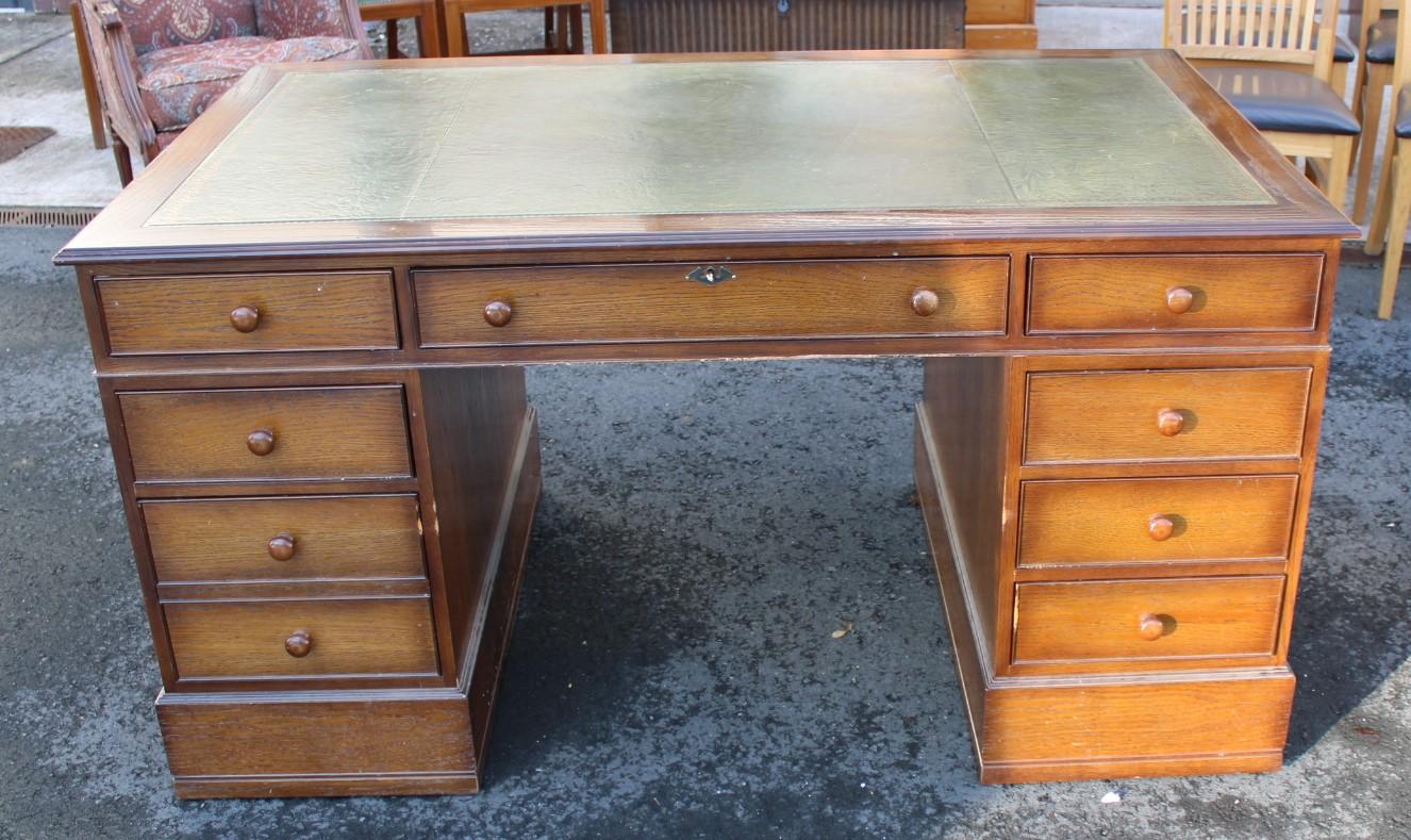 1960’s Solid Oak Pedestal Desk with Green Leather