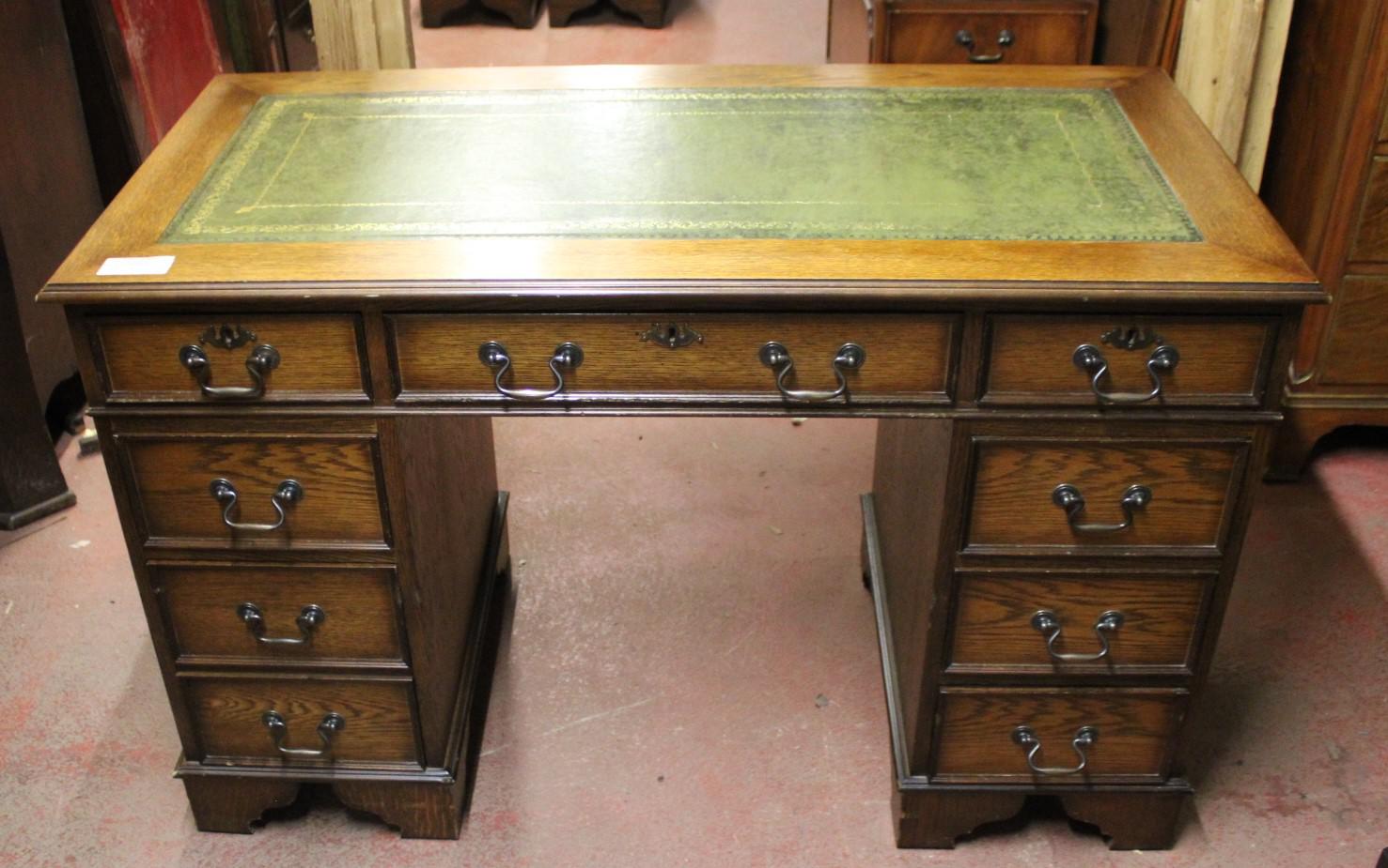 1960s Solid Oak Pedestal Desk with Green Leather Top