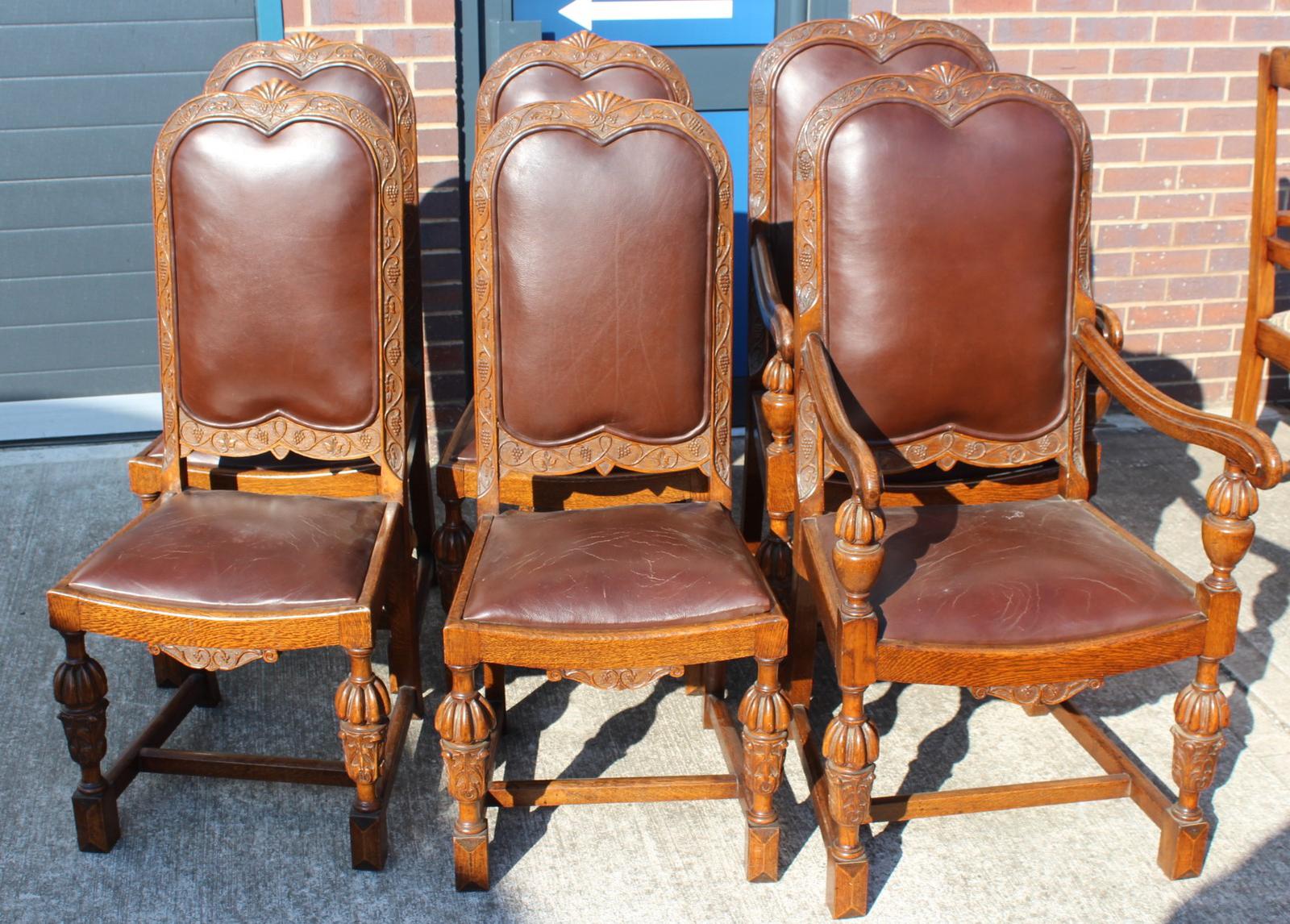 1960's Well Carved Set 6 Highback Oak Chairs with Burgundy Leather Seats.