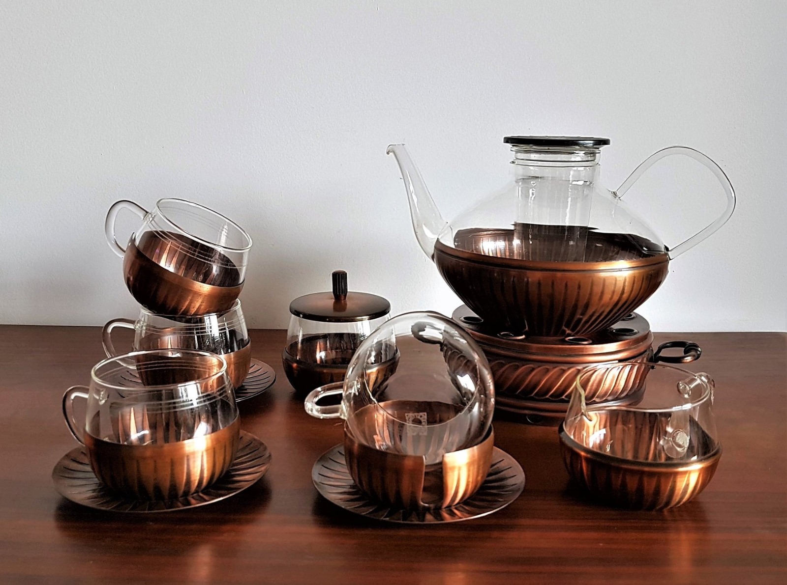 1960s West German Schott & Gen Mainz, Modernist Copper & Jenaer Glass Tea Set for 4