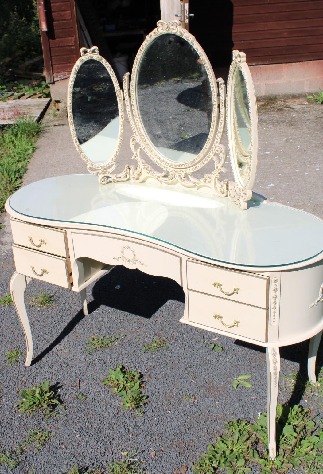 1960s White Dressing Table with Triple Mirror & Glass Top