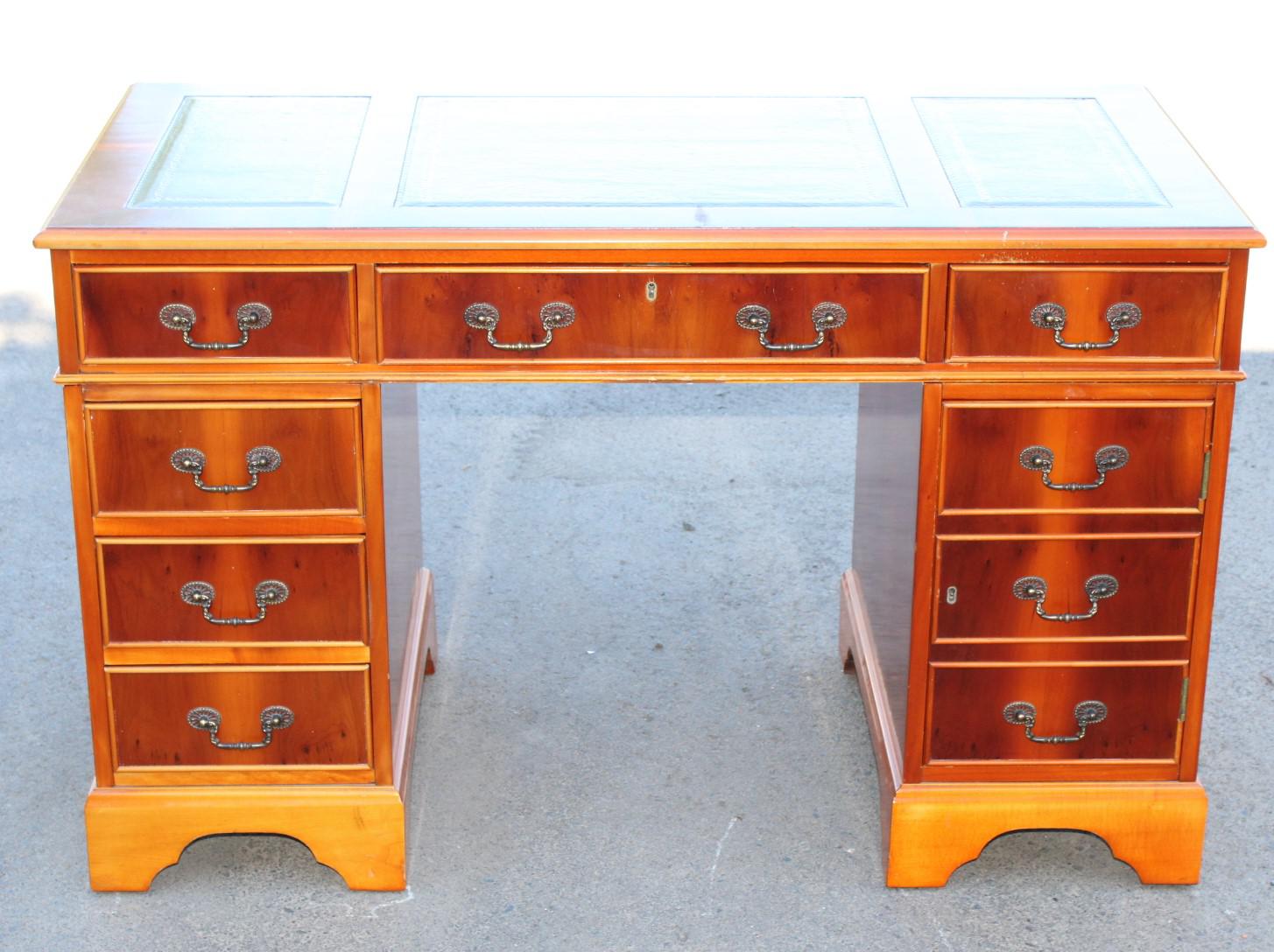 1960s Yew Wood Pedestal Desk with Green Leather Inset