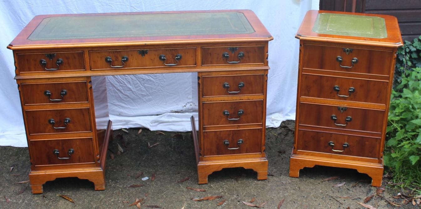 1960s Yew Wood Pedestal Desk with Green Leather Top + Matching Filing Cabinet