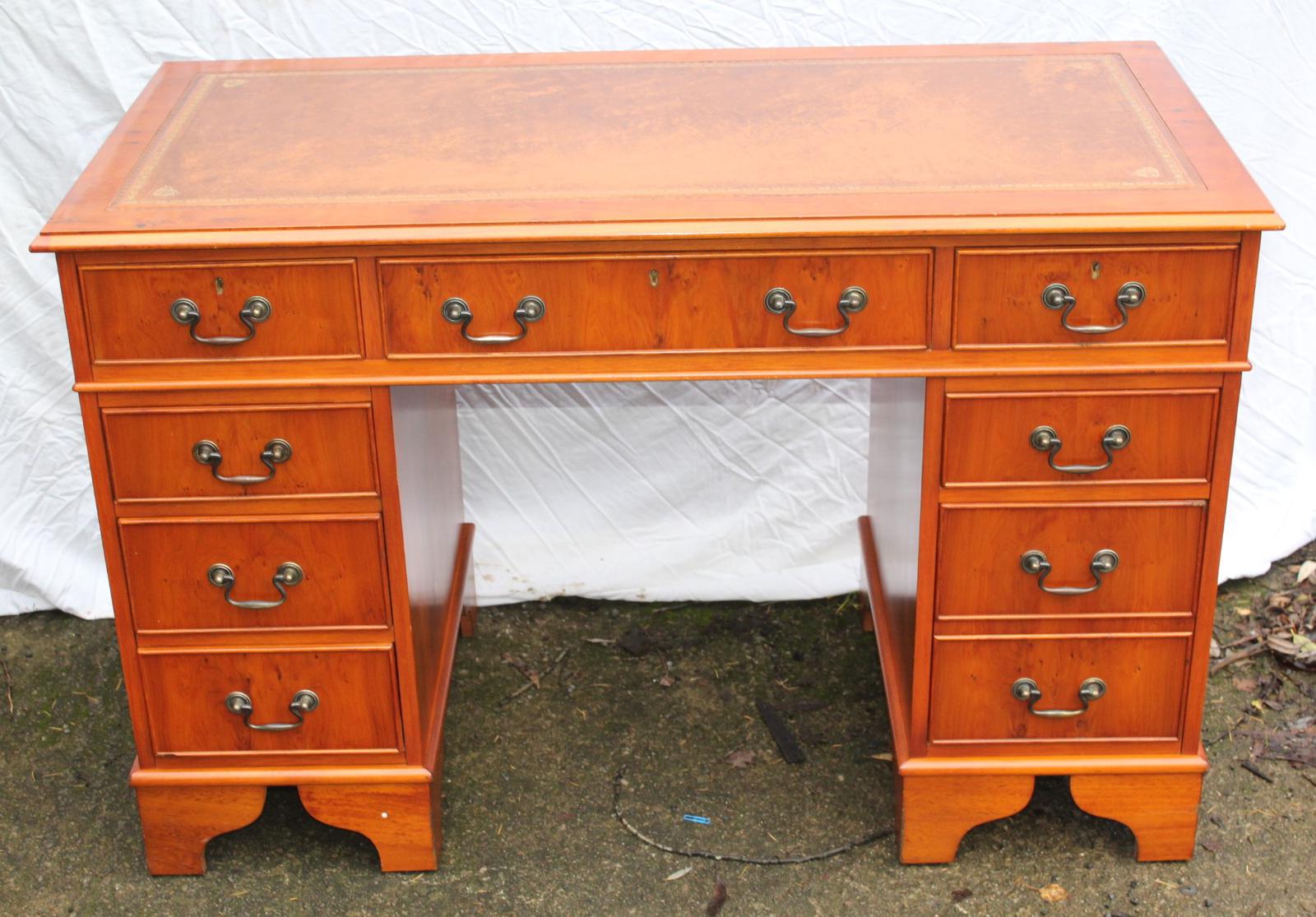 1960's Yew Wood Pedestal Desk with Tan Leather Top and Key.
