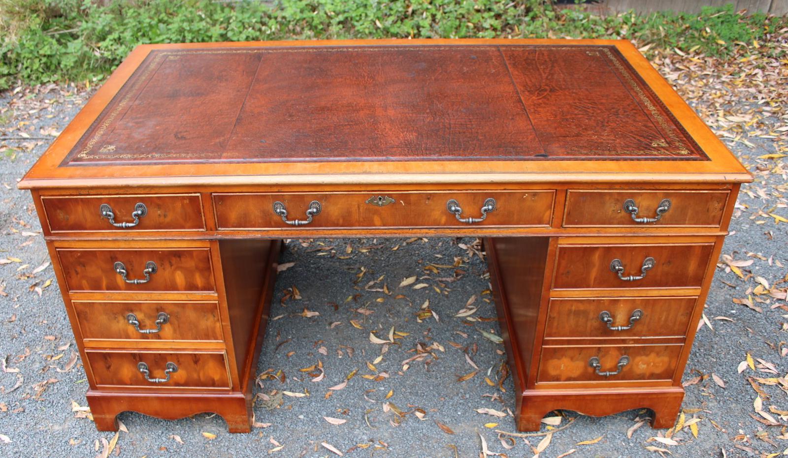 1960s Yew Wood Vaneers Pedestal Desk with Brown Leather