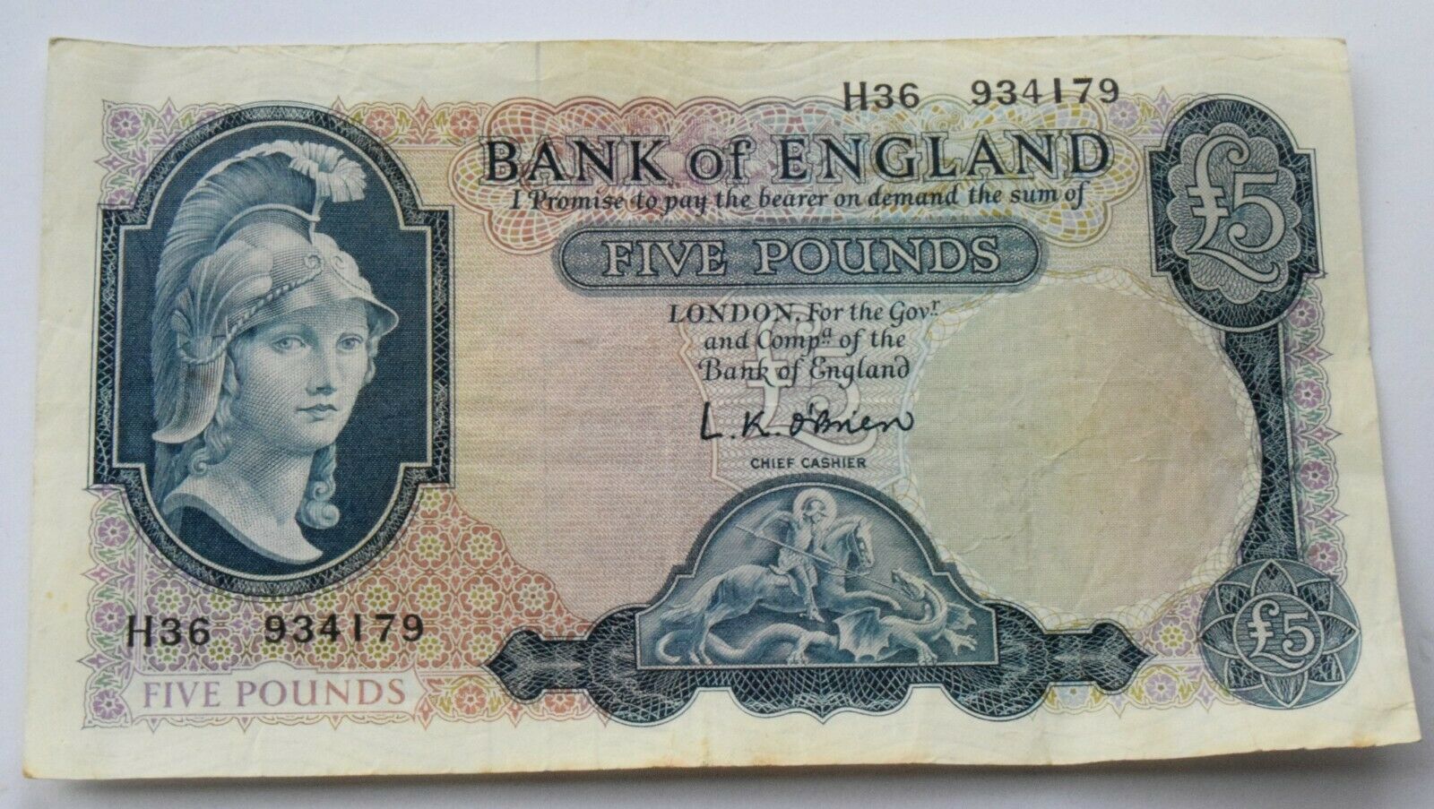 1961 Obrien Helmeted Britannia £5 Five Pound High Grade Banknote H36 934179
