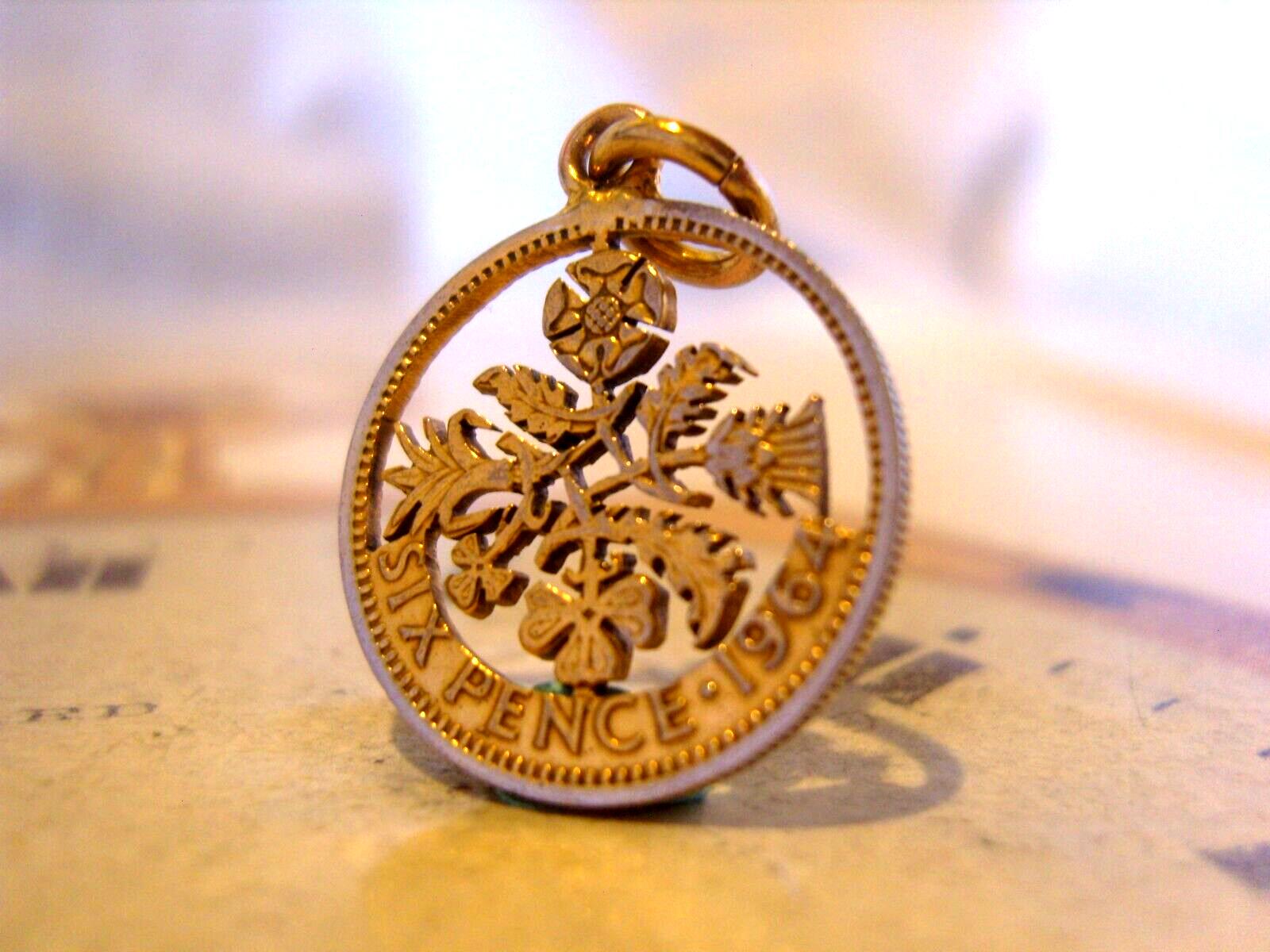 1964 Vintage Silver Sixpence Pocket Watch Chain Coin Fob Gold Plated