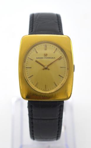 A 1970s Girard-Perregaux gold plated wristwatch. A gilt dial with a brushed finish, matching that of the case. Applied gilt hour markers, doubled at 12. The dial is surrounded by a thin minute track. Applied GP logo above the Girard-Perregaux script. The hours and minutes are indicated by thin gilt stick hands.