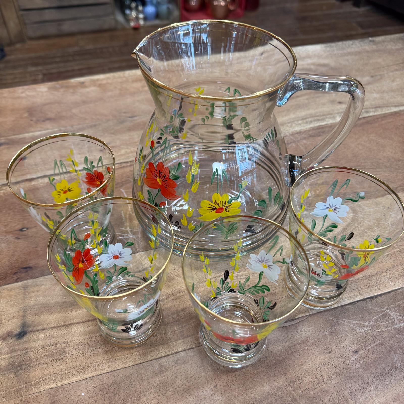 1970s Vintage Bohemian Hand Painted Glass Pitcher Lemonade Set