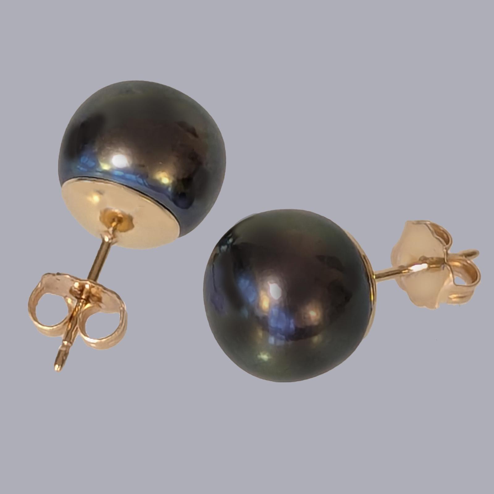 A beautifully elegant pair of black pearl earrings dating to the 1980s, set with high-quality cultured round pearls and fitted with solid 14ct gold posts.