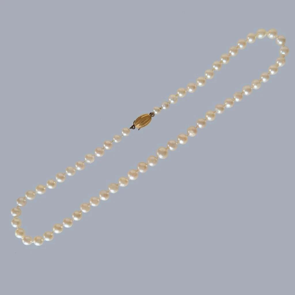 Each pearl has been individually hand-knotted in the traditional manner, ensuring both durability and a graceful drape when worn. The pearls display a soft creamy ivory tone with a rich, even lustre, giving the necklace a classic and flattering appearance at the neckline.