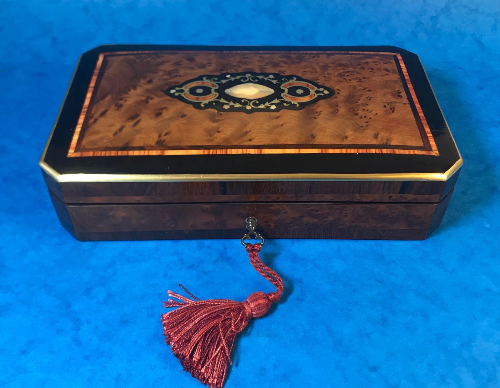 19th Century 1860 French Burr Cedar, Rosewood, Tulipwood, Brass Bound Jewellery Box
