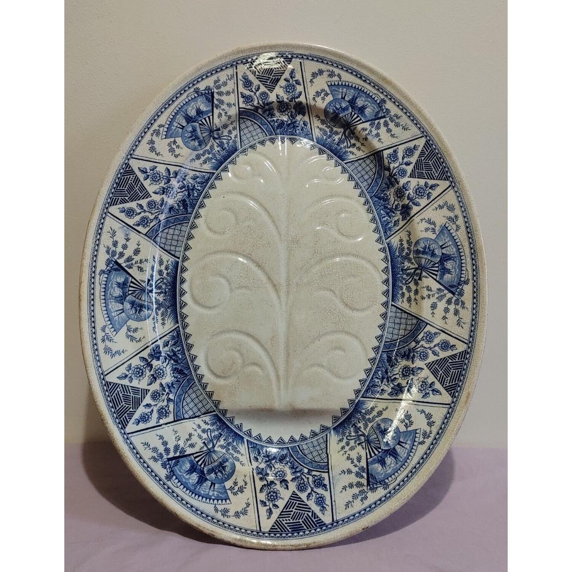 19th Century Aestheticism Old Hall Pottery Blue White Antique Ceramic Meat Plate 54cm