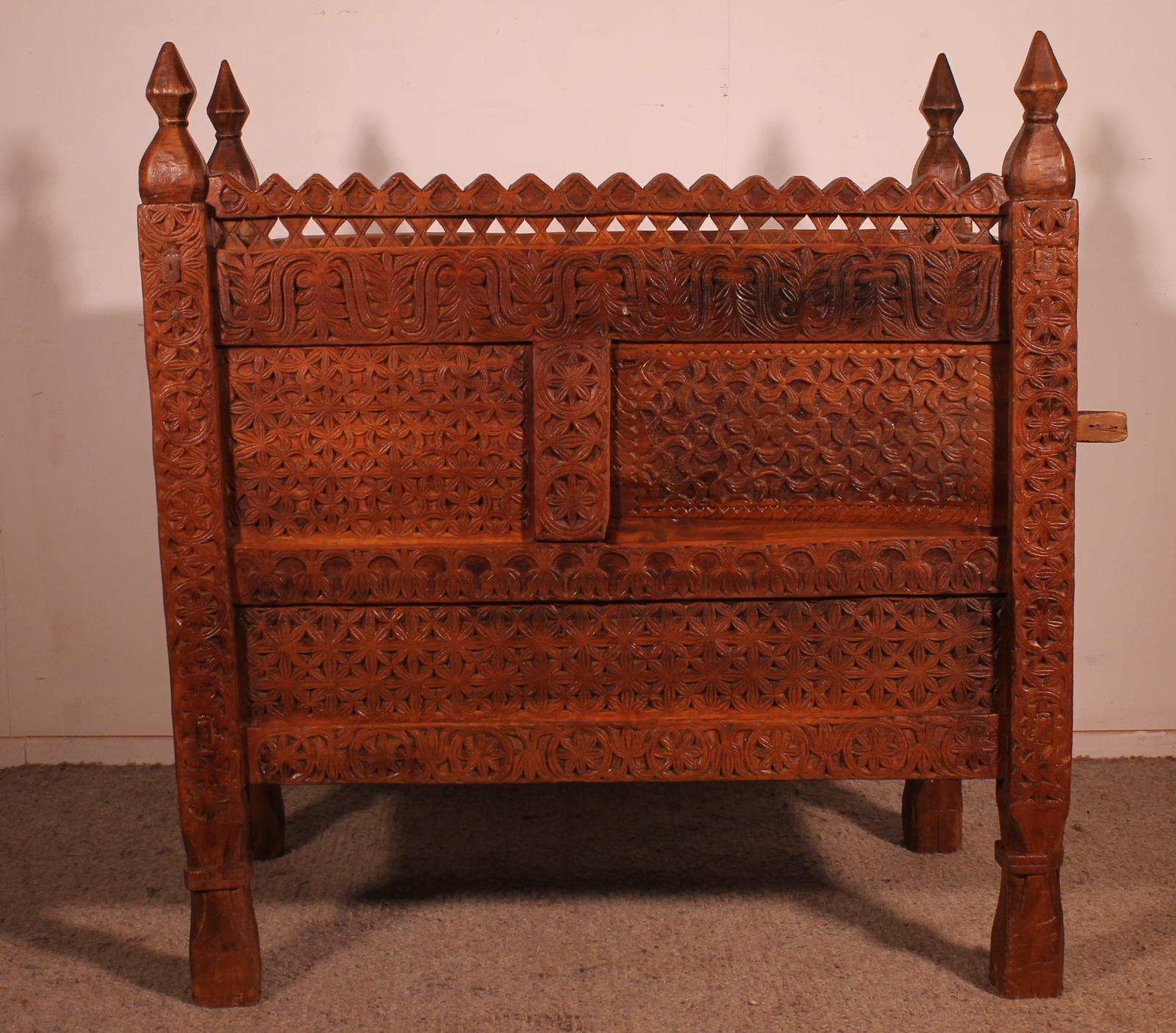 Superb Afghan chest from the first half of the 19th century, made of solid wood. The chest is finely carved with geometric shapes on the front. It opens from the side. In superb condition with a magnificent medium walnut patina. A rare and decorative piece, it integrates perfectly into various interiors. Restorations consistent with age and use.